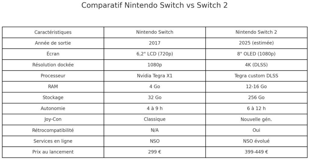 | Switch 2 Pro / Premium | 449-499 € | Plus grand écran, 4K, accessoires |